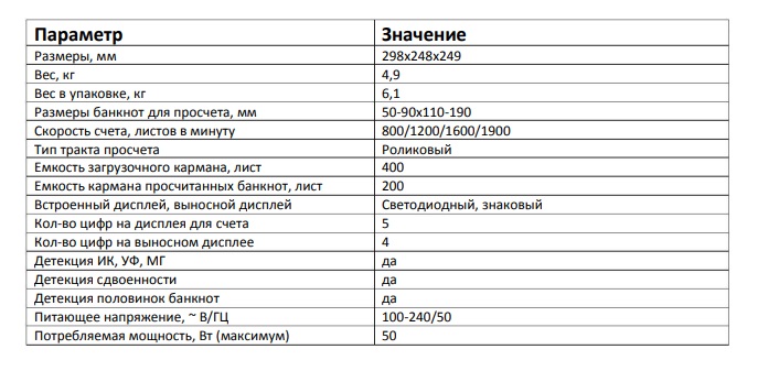 Оператор видит на дисплее число купюр, наличие подозрительных купюр, возможные ошибки. Показывается активный датчик детекции. Уровень шума при работе не превышает 70 децибел.