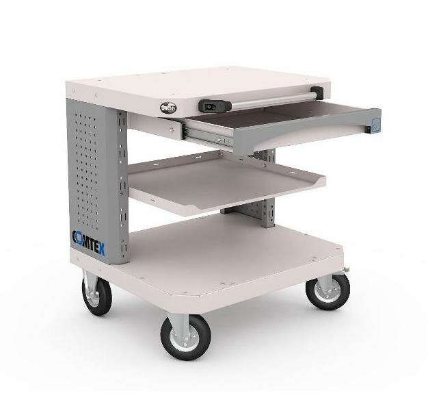 В комплектацию тележки Comtex №2 входит: тележка Comtex с колесами и ручкой, полка 480х520 Comtex, ящик 60 Comtex. Стойки тележки имеют телескопическую конструкцию, что позволяет изменить высоту стойки от 442 до 842 мм с шагом 44,45 мм. Полка устанавливается на всю ширину тележки. Шаг установки полки 25 мм. Полезные размеры ящика 60 Comtex - 64х470х420 мм. На задней стенке тележки предусмотрены кабелепроводы и вентиляционные отверстия. Ручку для перемещения тележки возможно устанавливать с двух сторон. Колеса полиуретановые диметром 125 мм (2 неповоротных, 1 поворотное, 1 поворотное с тормозом). Цвет: серый Ral 7035, стойки тележки - темно-серые Ral 7046. Тележка поставляется в собранном виде