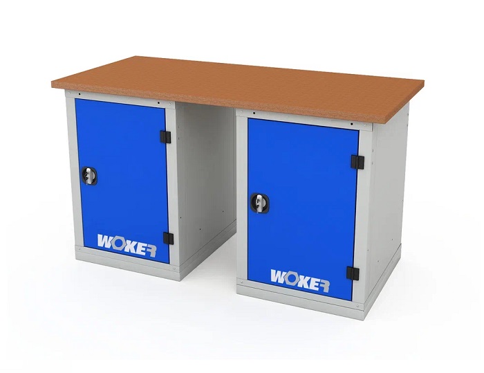 В комплектацию верстака входит: столешница Woker 1500, две тумбы Woker 01. Столешница выполнена из шлифованной березовой многослойной фанеры толщиной 30 мм. Снаружи фанера обработана влагостойким антисептиком цвета "красное дерево", что придает фанере повышенную влагостойкость и более темный цвет. Тумба Woker 01 имеет две полки регулируемые по высоте с шагом 50 мм. Полки тумбы установлены на стальные салазки, которые позволяют выдвигать полку на себя на 70% для облегчения разгрузки/погрузки. Дверь тумбы закрывается на цилиндрический ключевой замок со стальной поворотной ручкой, секретность замка 2000 комбинаций. Открывание двери на 180 градусов.